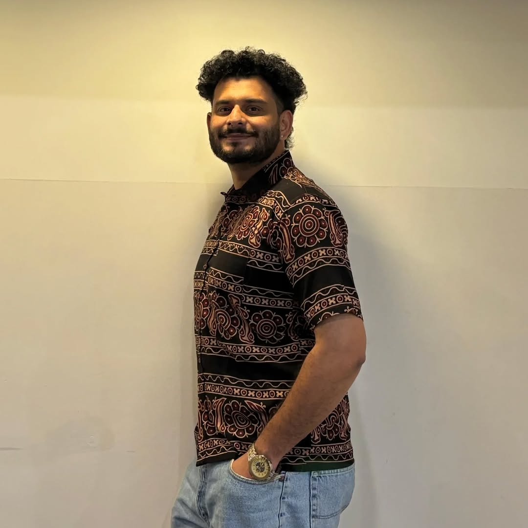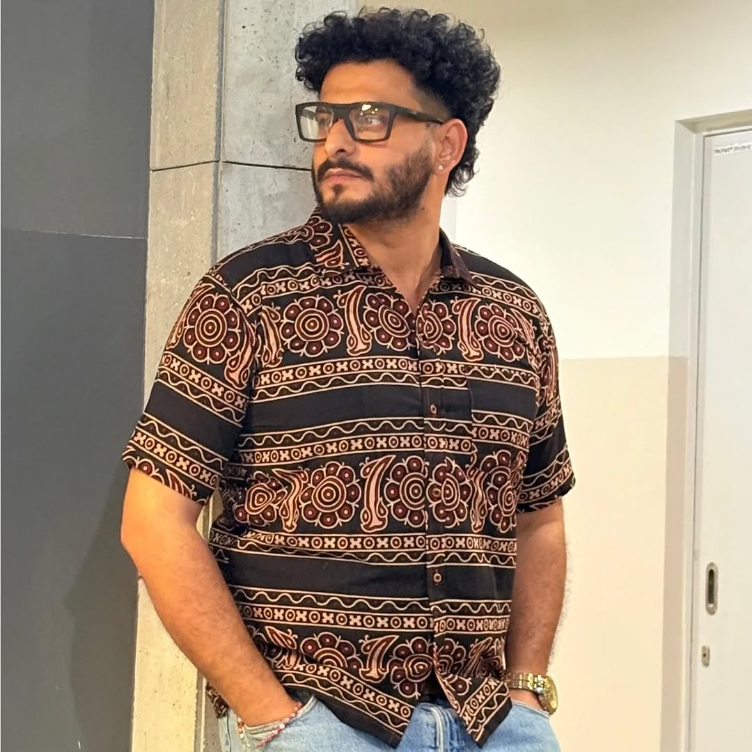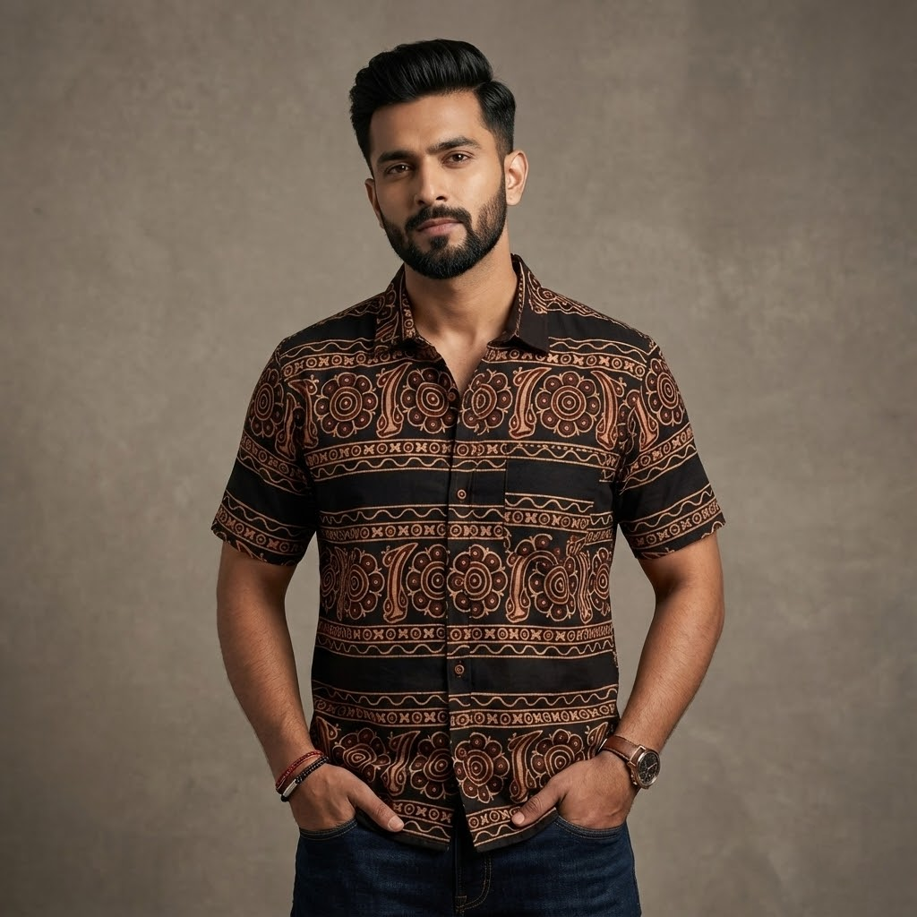 Premium Ajrakh Bold Print Shirt –Earth Tone Collection. Sand & Charcoal Panels.